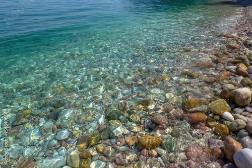 Clear water laps against a pebbled shoreline under the bright sun during a summer vacation