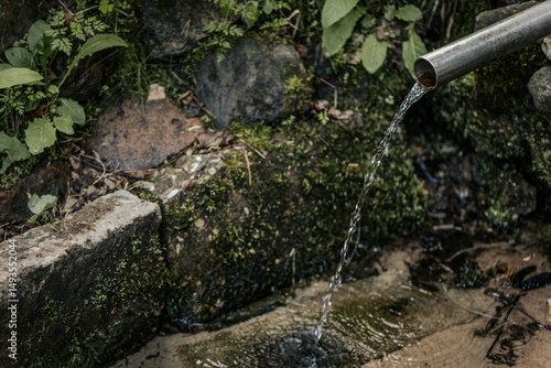 Clear water streams from a metal pipe in a natural outdoor setting, with a soft-focus background of earthy tones and greenery.