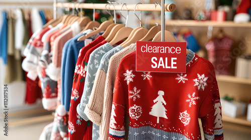 Clearance sale featuring holiday themed sweaters on clothing rack