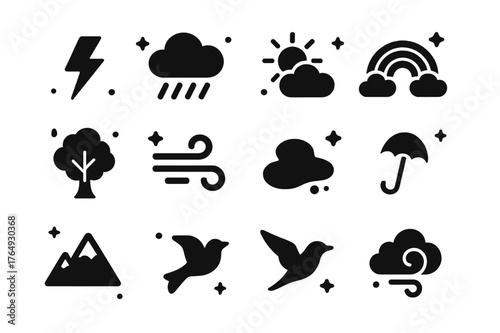 Clearing Storm Icons. Clearing Storm. Solid icons set of Clearing Storm: lightning, rain, cloud, sun, rainbow, tree, wind, puddle, umbrella, mountain, bird,