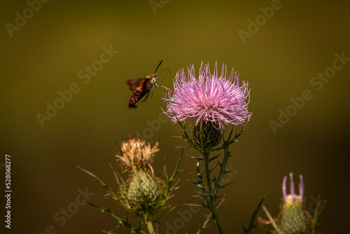 Clearwing Hummingbird Moth collects nectar from thistle flowers