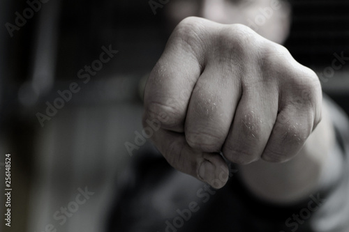 Clenched fist close up. Unrecognizable angry and violent man image with copy space.