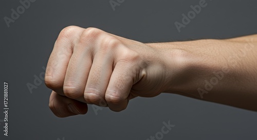 Clenched fist in sharp light, veins and muscles defined against a muted gray background, capturing raw strength, resilience, and the tension of human determination
