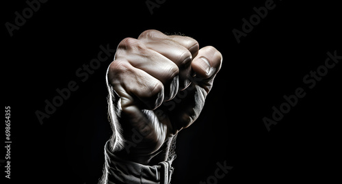 clenched fist is raised up against a dark background, showing detail and strength, with light highlighting the fist's texture and power