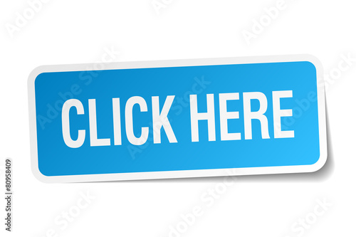 click here blue square sticker isolated on white