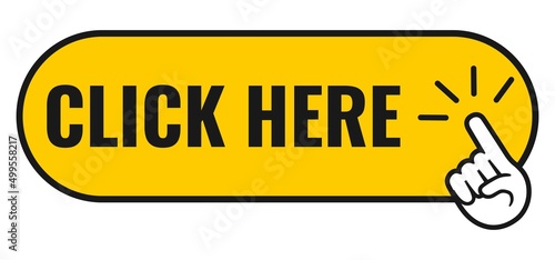 Click here vector web button. Isolated website buy or register yellow bar icon with hand finger clicking cursor for buy or register design template