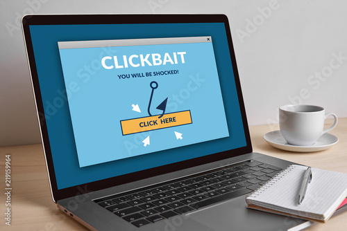 Clickbait concept on modern laptop computer screen on wooden table. All screen content is designed by me.