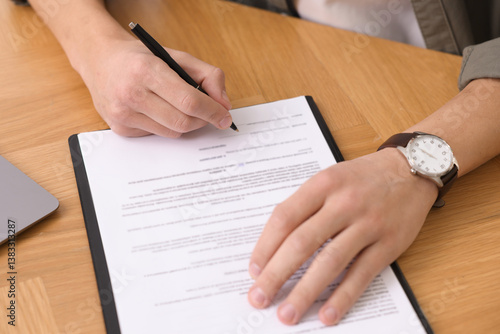 Client signing notarial document at wooden table in office, closeup