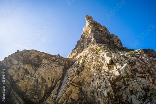 Cliffs, sharp spectacular rocks rising from the ocean. waves. Ursa sandy beach under the cliff. Sunny day. Horizontally
