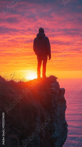 Cliffside Contemplation, a lone figure poised on a precipice, gazing at the vast horizon, embodying solitude and introspection.