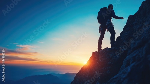 Climber ascending a mountain at sunset with vibrant colors illuminating the sky