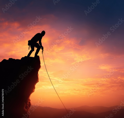 Climber descends cliff at sunset