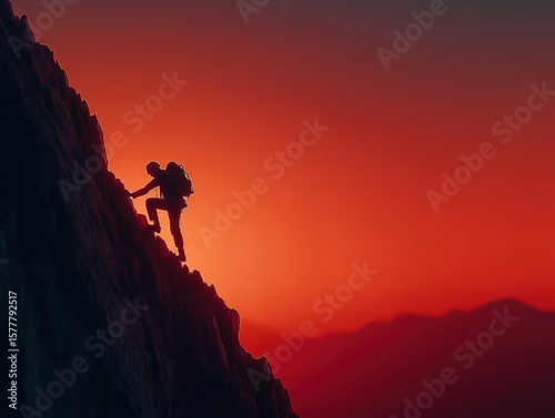 Climber gripping rock fissure on cliff face at sunset, silhouetted figure against vivid red gradient sky with distant range contours