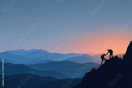 Climber Helping Partner on Mountain Silhouette – Sunrise Over Blue Layered Peaks – Teamwork Concept with Copy Space for Branding