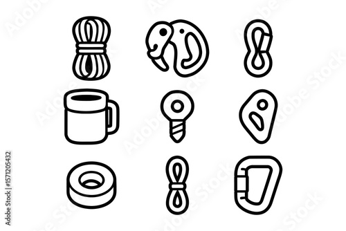Climbing equipment icon set for sport, adventure, climber. Rock climbing gear outline set. Mountaineering tools vector including ropes, chalk bag, tape, loop, hook, carabiner, bolt and holds