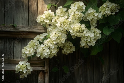 Climbing Hydrangea in full bloom, cascading over a rustic wooden trellis