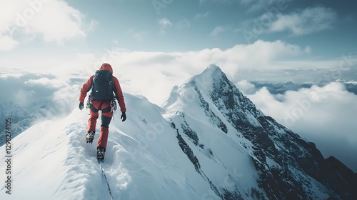 Climbing to new heights: A determined climber ascends a snow-covered mountain ridge, surrounded by a panorama of clouds and peaks, showcasing the thrill of mountaineering.