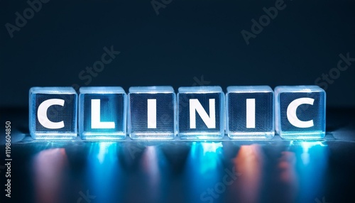 病院を意味する英単語のCLINICの文字が書かれたキューブブロックが横に並んでいる。aiで生成