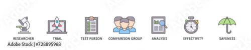 Clinical study icon set flow process illustrationwhich consists of researcher, trial, test person, comparison group, analysis, effectivity, and safeness icon live stroke and easy to edit