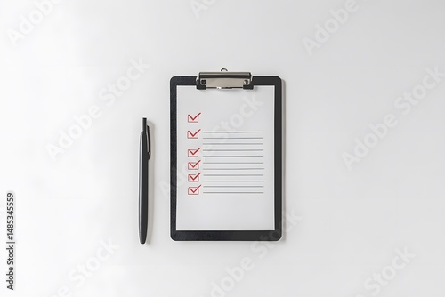 Clipboard and pen with checklist showing tasks completed on a clean white background