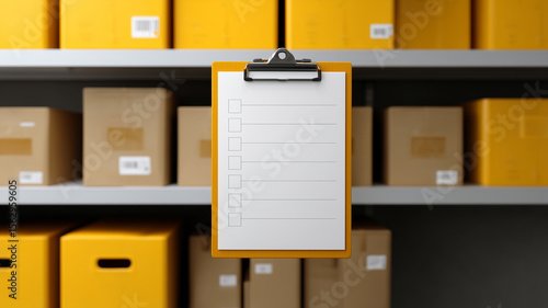 Clipboard checklist warehouse storage box shelf organization inventory management and efficiency describe well organized