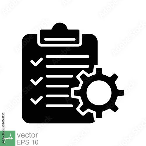 Clipboard with gear icon. Simple solid style. Project plan, document, compliant, task check list, cog, management concept. Glyph vector illustration isolated on white background. EPS 10.