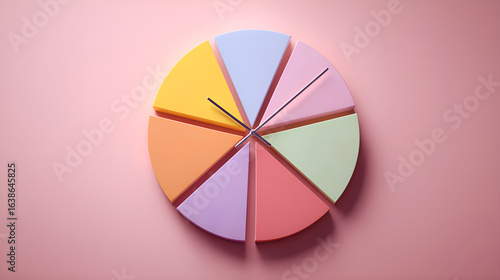 Clock hands dividing colorful pie chart on pink background
