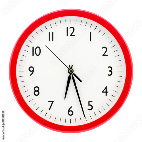 Clock with red round frame on white isolated background shows 6 hours 27 minutes_