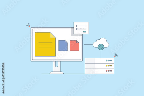 Clod storage, data synchronization to cloud server. Documents securely stored in cloud network, devices connected to cloud storage. Vector illustration background.