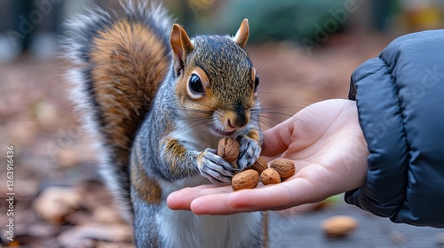 Close encounter with a squirrel enjoying nuts from a boys hand in New York City during a sunny afternoon
