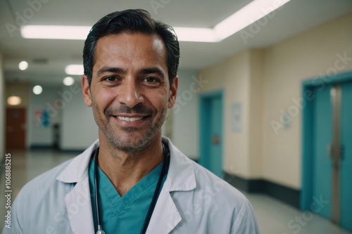 Close portrait of a smiling 40s Panamanian man doctor looking at the camera, Panamanian hospital blurred background