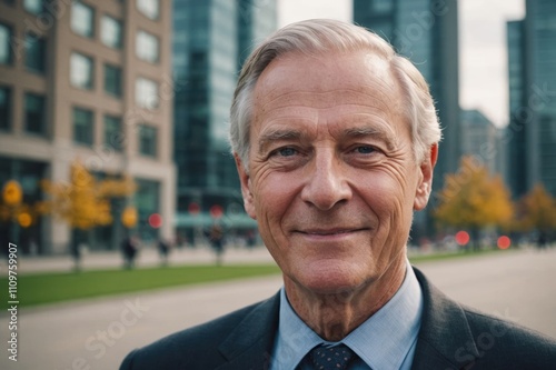 Close portrait of a smiling senior Canadian businessman looking at the camera, Canadian big city outdoors blurred background