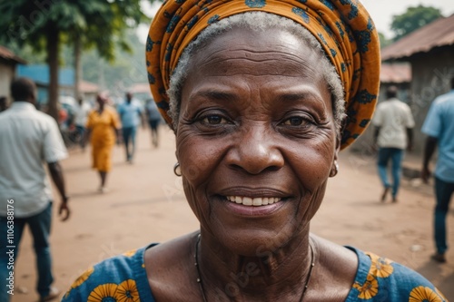 Close portrait of a smiling senior Congolese woman looking at the camera, Congolese city outdoors blurred background