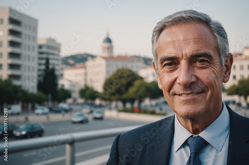 Close portrait of a smiling senior Greek businessman looking at the camera, Greek big city outdoors blurred background