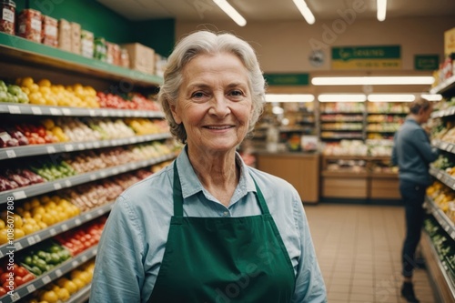 Close portrait of a smiling senior Lithuanian female grocer standing and looking at the camera, Lithuanian grocery store blurred background