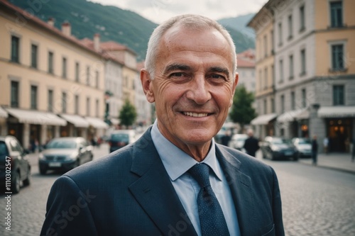 Close portrait of a smiling senior Montenegrin businessman looking at the camera, Montenegrin big city outdoors blurred background