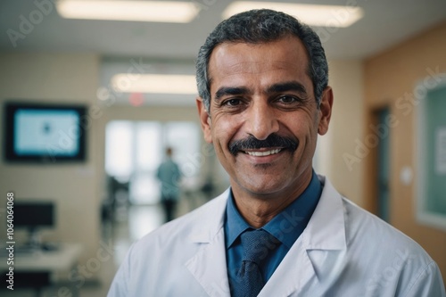 Close portrait of a smiling senior Qatari man doctor looking at the camera, Qatari hospital blurred background
