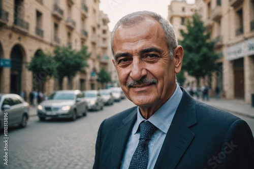 Close portrait of a smiling senior Syrian businessman looking at the camera, Syrian big city outdoors blurred background