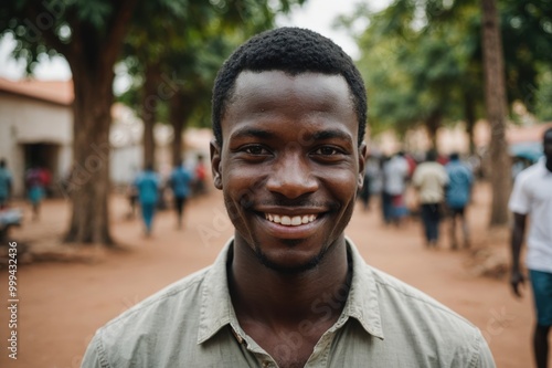Close portrait of a smiling young Burkinabé man looking at the camera, Burkinabé outdoors blurred background