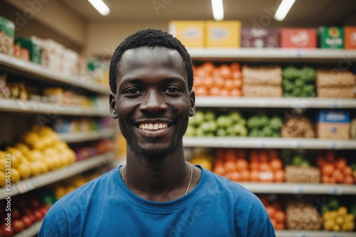 Close portrait of a smiling young South Sudanese male grocer standing and looking at the camera, South Sudanese grocery store blurred background