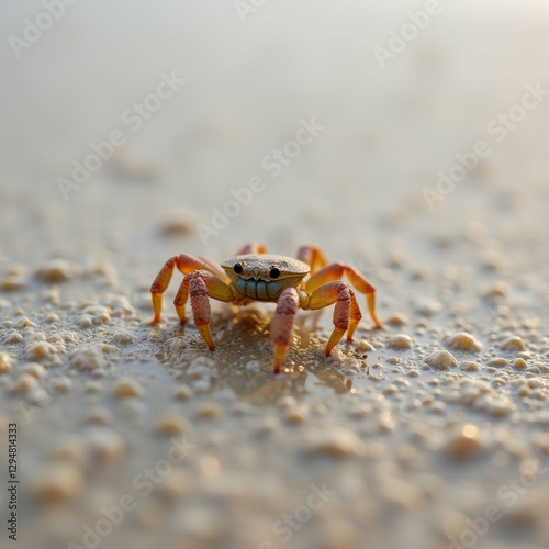 close small crab sandy beach crab facing towards right side its body slightly blurred background has orange legs claws its eyes bright blue color sand covered small pebbles small amount water