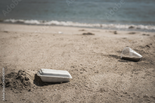 Close trash white foam fast food container for take away service, a lot plastic spilled trash on sea nature beach sand sun day, problem earth ocean pollution contamination, environmental protection