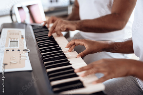 Close up. A black man sits in the living room of his apartment and plays a synthesizer. A girl is sitting next to him.