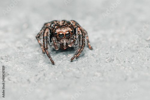 Close up a colorful jumping spider on cement floor, Selective focus, macro shot, Thailand.