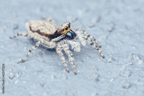 Close up a colorful jumping spider on cement floor, Selective focus, macro shot, Thailand