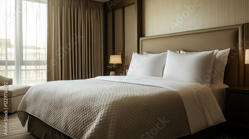 close up A hotel bed styled with layered linen sheets, soft pillows, and a beige quilt, exuding modern simplicity