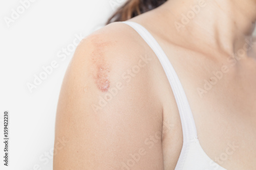 Close up a large scars from vaccination on the right arm of Asian young woman
