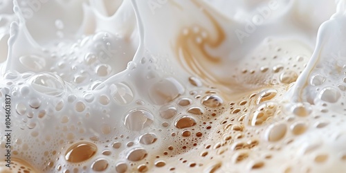 Close up abstract brown caramel shapes latte art in coffee. Liquid texture coffee background macro. Cappuccino and milk foam close up view. High quality photo