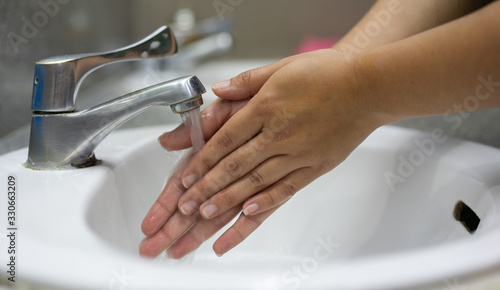 close up adult woman washing and rubbing hand while opening faucet to cleaning for protection and prevent virus or coronavirus (COVID-19) and bacteria concept