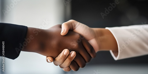 Close up african american businesswoman shaking hands with caucasian client. Women's shake hands as hello closeup. Friend welcome, introduction, greet or thanks gesture. digital art